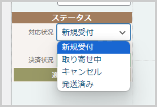 新規受付 / 取り寄せ中 / キャンセル /発送済みのステータスがあります。